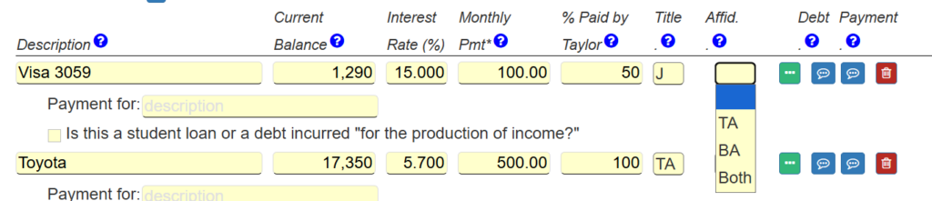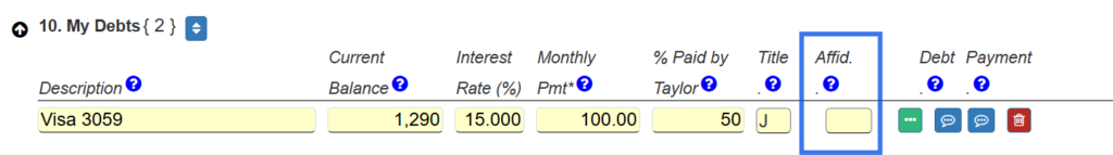 2. How do I get the amount being paid currently on the debt to flow to the correct person’s affidavit?