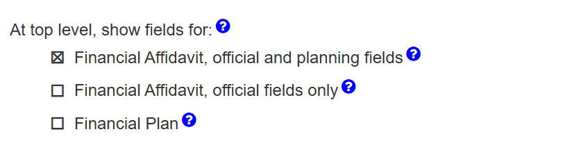 To make the “Affidavit” drop down appear on the Debts line at the top level, specify in the checkbox at the very top of the screen that you want to enter information for the financial affidavit, as shown below.