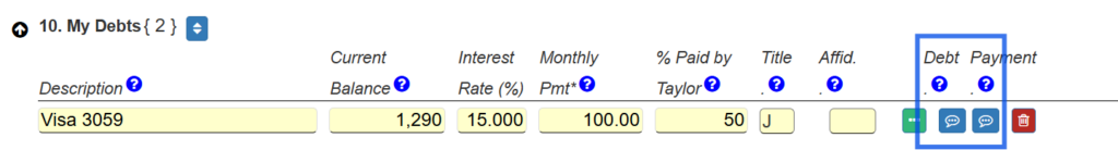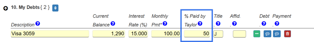 Tags: Allocate debts between parties, Debts flow to Affidavit, show debt for one party on affidavit, specify debt payment to other party